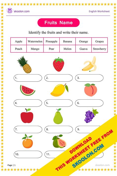Fruits are an important part of any healthy diet, and learning their names in English can be a great way for kids to expand their vocabulary. This worksheet is designed to help kids learn the names of some of the most popular fruits in English, as well as some fun facts about them. We hope you enjoyed this worksheet and that it helps your kids learn more about fruits.